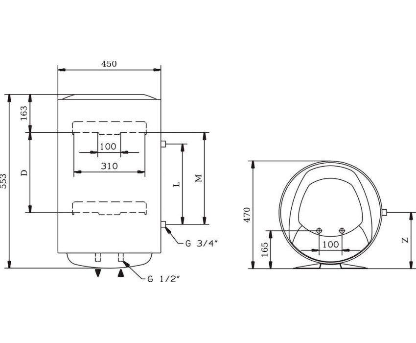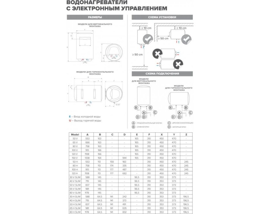 Водонагреватель накопительный 50л, Настенный-Вертикальный, Управление Электронное, Материал внутреннего бака Нержавеющая сталь, внутренних баков 1, нагревательных элементов 2, 3 режима нагрева, Время нагрева всего объема (T=45°С) 1 ч 45 мин / 1 ч 03 мин, Функция "Активная электрическая защита", "защита от включении без воды", Кабель питания с УЗО, ВхШхГ 553х450х470 мм, Вес 12 кг.