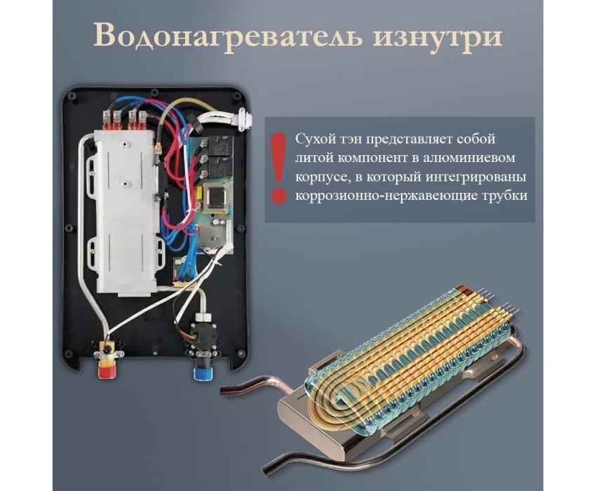 Технические характеристики Электропитание: 380–400 В ~ 50/60 Гц (трёхфазное) Номинальная мощность: 10 кВт Тип водонагревателя: проточный напорный Диапазон температур горячей воды: 35°С – 55°С Максимальная температура: 55°С Производительность: 6–7 л/мин горячей воды Минимальный расход для включения: 1,5 л/мин Номинальное давление воды на входе: 0,6 МПа (6 бар) Рабочее давление воды: 0,03–0,6 МПа (3–6 бар) Максимальное давление: 1,2 МПа (12 бар) Управление: электронная сенсорная панель из закалённого стекла Класс защиты от поражения электротоком: I Степень защиты: IP25 Диаметр подключения: 1/2″ НР (наружная резьба) Способ монтажа: настенный Габаритные размеры (В × Ш × Г): 400 × 260 × 65 мм Вес брутто: 6 кг