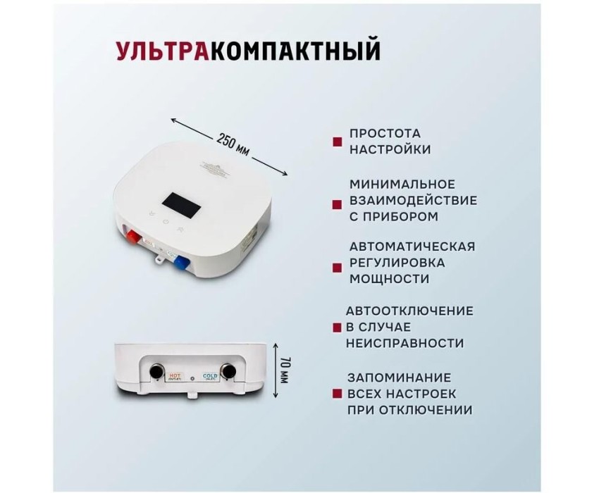Технические характеристики Резьба для подключения воды 1/2 дюйма Мощность 5.5 кВт Напряжение сети 220(230) В Высота 230 мм Глубина 70 мм Ширина 250 мм Мах тем-ра нагрева воды 55 °С Управление сенсорное Самодиагностика да Цвет белый Защита от перегрева есть Производительность 5 л/мин Ограничение температуры нагрева есть Тип ТЭНа сухой Установка горизонтальная Способ крепления настенный Антизамерзание нет Форма прямоугольная Серия THERMA Габариты без упаковки 250х230х70 мм Вес нетто 3 кг Степень защиты от воды IPX4 IP Дисплей есть Индикация включения есть Способ подачи воды напорный Подводка нижняя