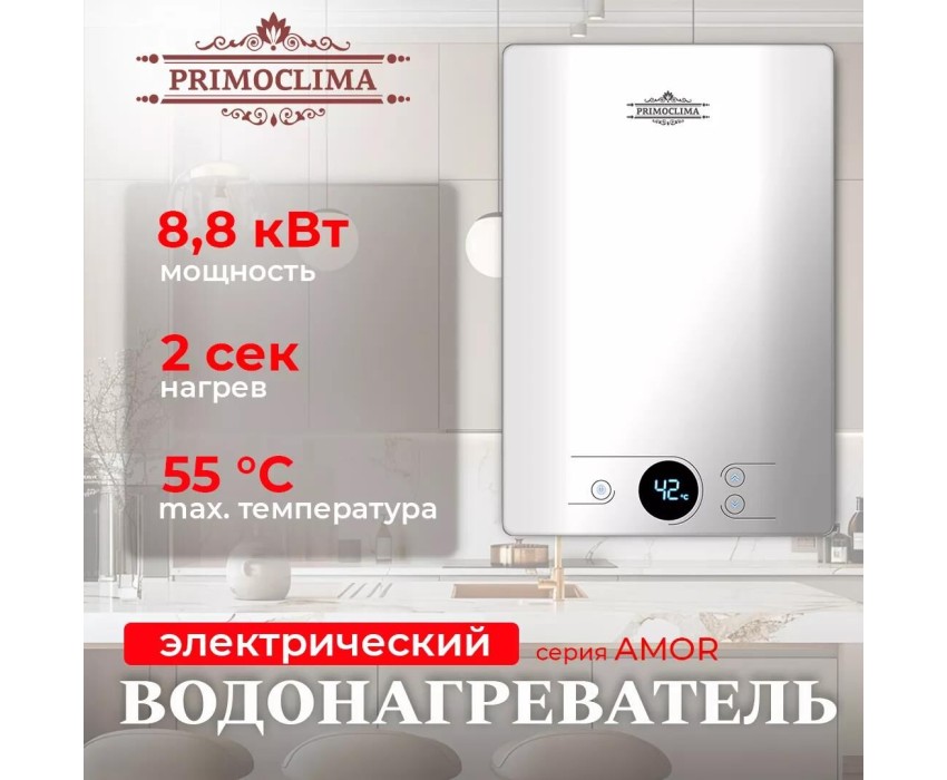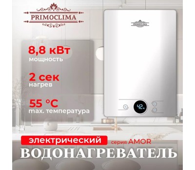 Водонагреватель проточный PRIMOCLIMA Электрический проточный водонагреватель AMOR 8.8 кВт, белый