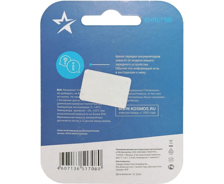 Аккумулятор КОСМОС KOCNI-MH6F22(200MAH)