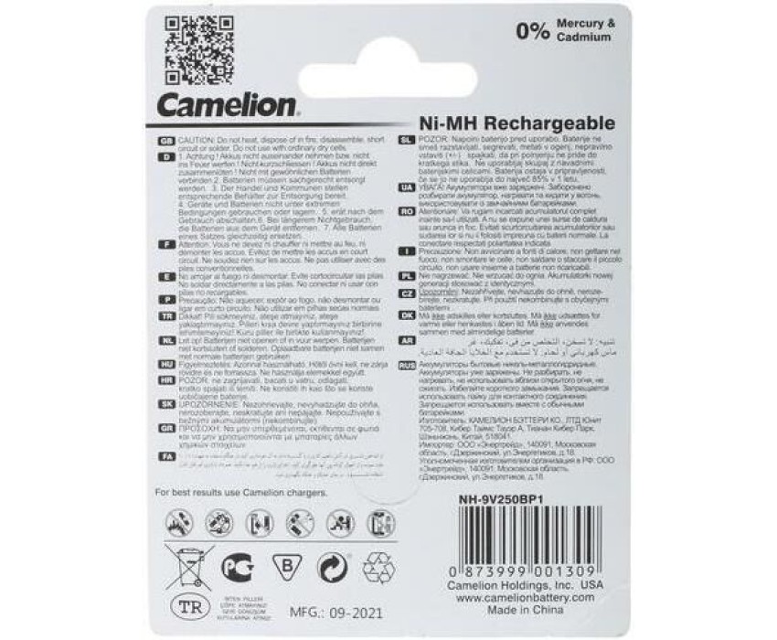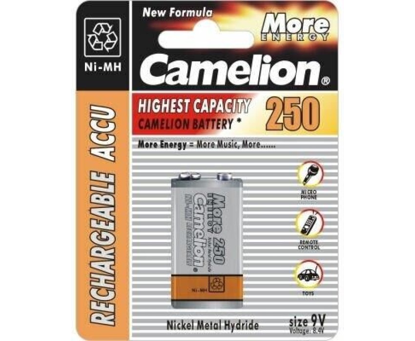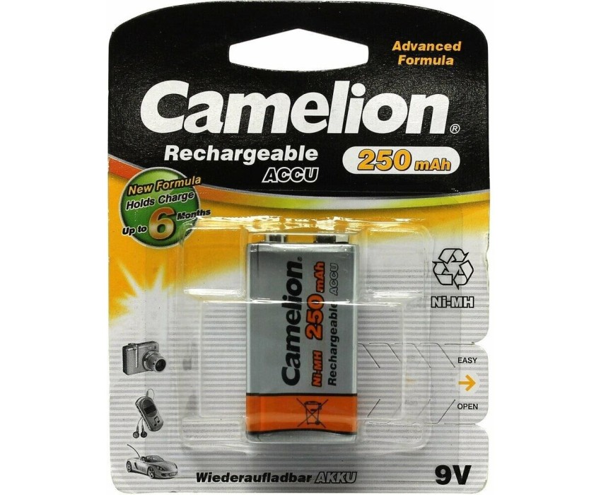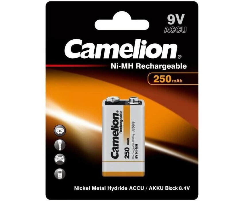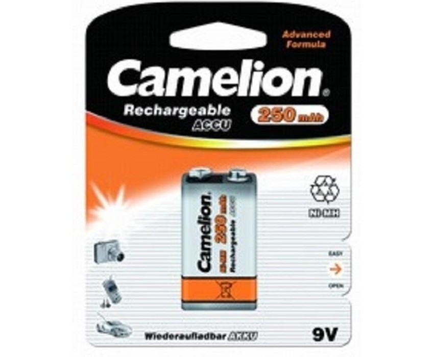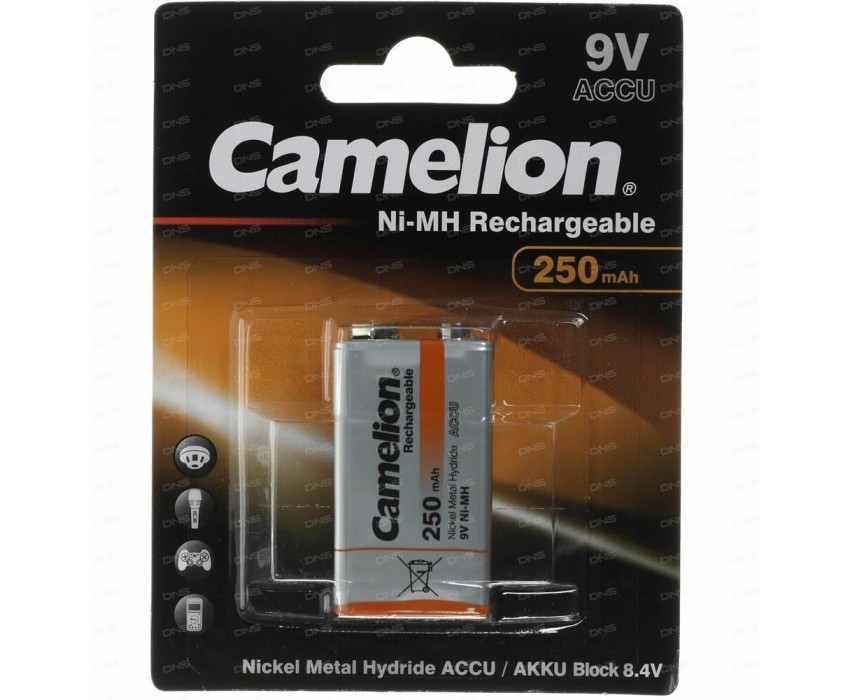 Аккумулятор Camelion NH-9V250BP1, напряжение 9В, емкость 250мА*ч, кол-во в упаковке 1 шт., размер упаковки 90x117x18 мм, использовать при температуре от - 20 до + 40 °C