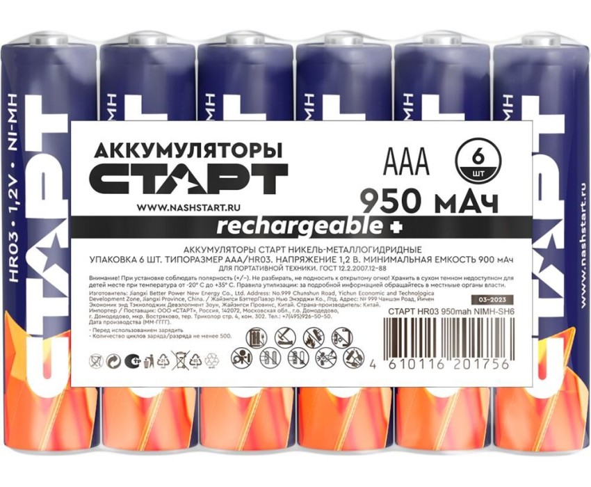 Аккумуляторы СТАРТ HR03 ААА 950mah NIMH-SH6 Характеристики: Напряжение: 1,2 В; Емкость: 950 мАч Электрохимическая система: никель-металлогидридные Типоразмер: ААА, HR03 6 шт. в шринке