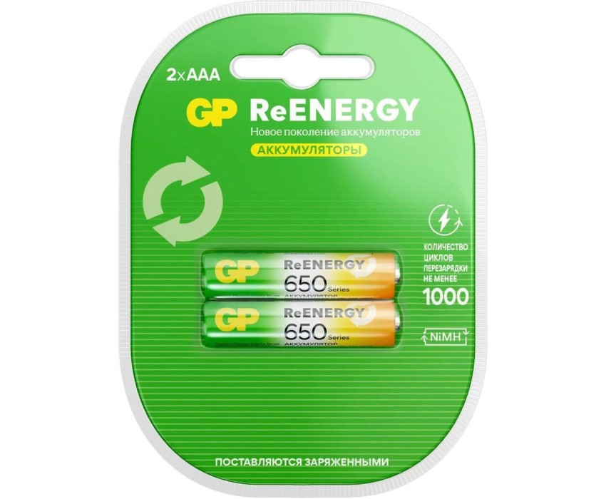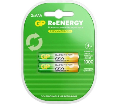 Перезаряжаемые аккумуляторы GP ReEnergy 65AAAHC AAA, емкость 650 мАч - 2 шт. в клемшеле