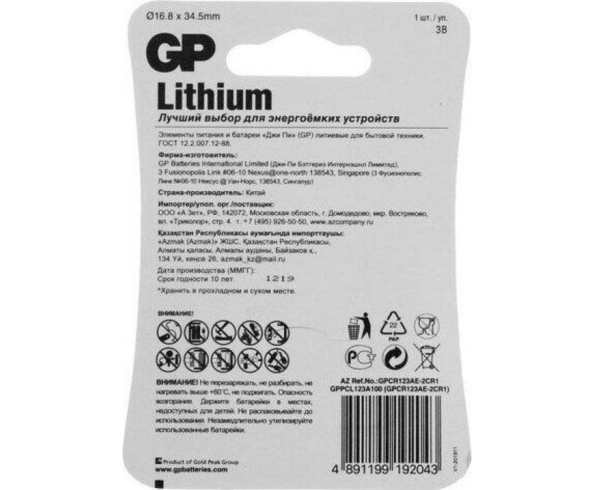 Элементы питания GP (15356) CR123AE-2CR1 (CR123A)
