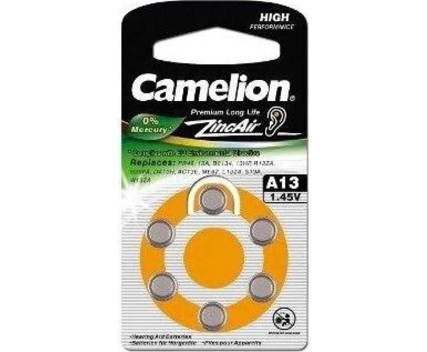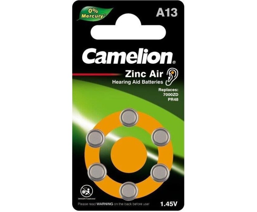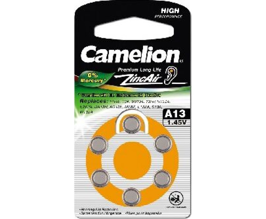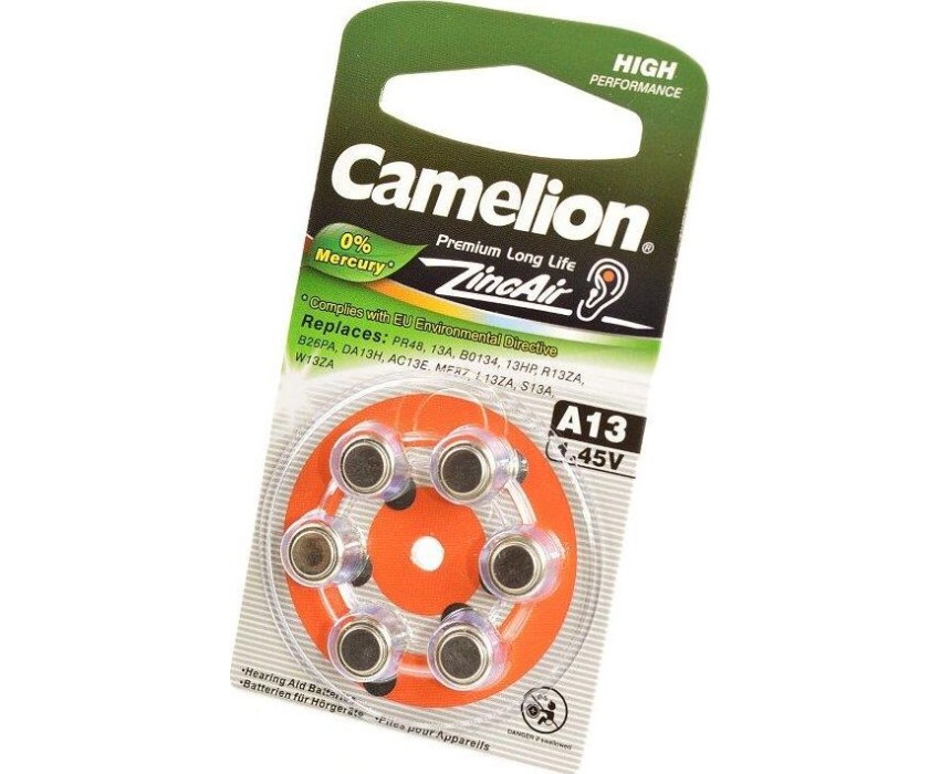 Батарейка Camelion ZA13 BL-6 Mercury Free (A13-BP6(0%Hg), батарейка для слуховых аппаратов, 1.4 V,280mAh), напряжение 1,4В, емкость 280мА*ч, кол-во в упаковке 6 шт., размер упаковки 40x90x4 мм, использовать при температуре от 0 до + 50 °C, хранить при температуре от +15 до +25 °C. Срок хранения 3 года.