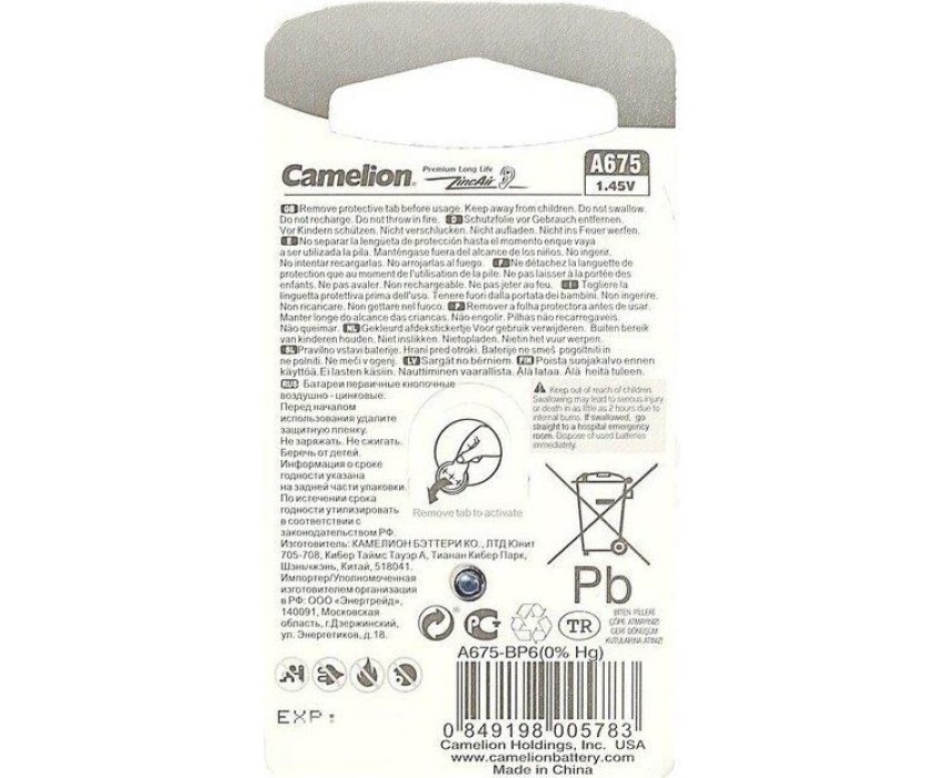 Элементы питания CAMELION (12826) ZA675 BL-6