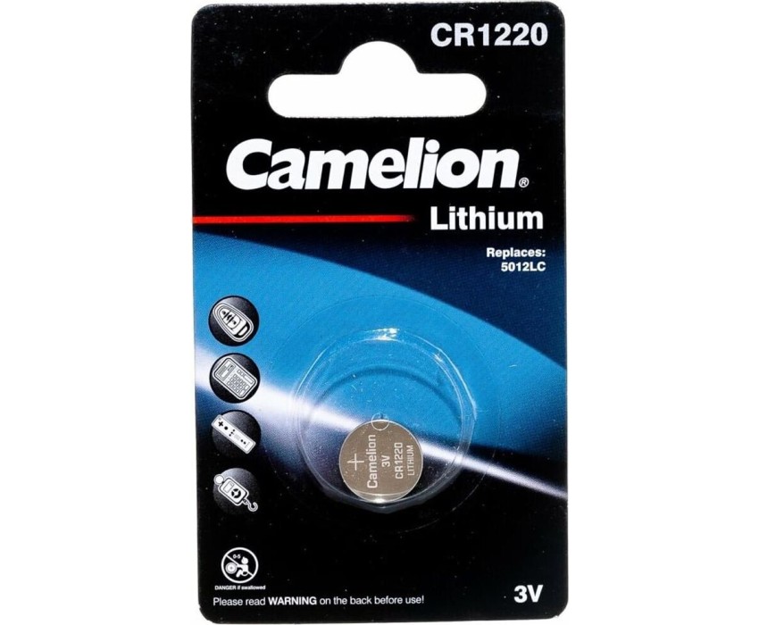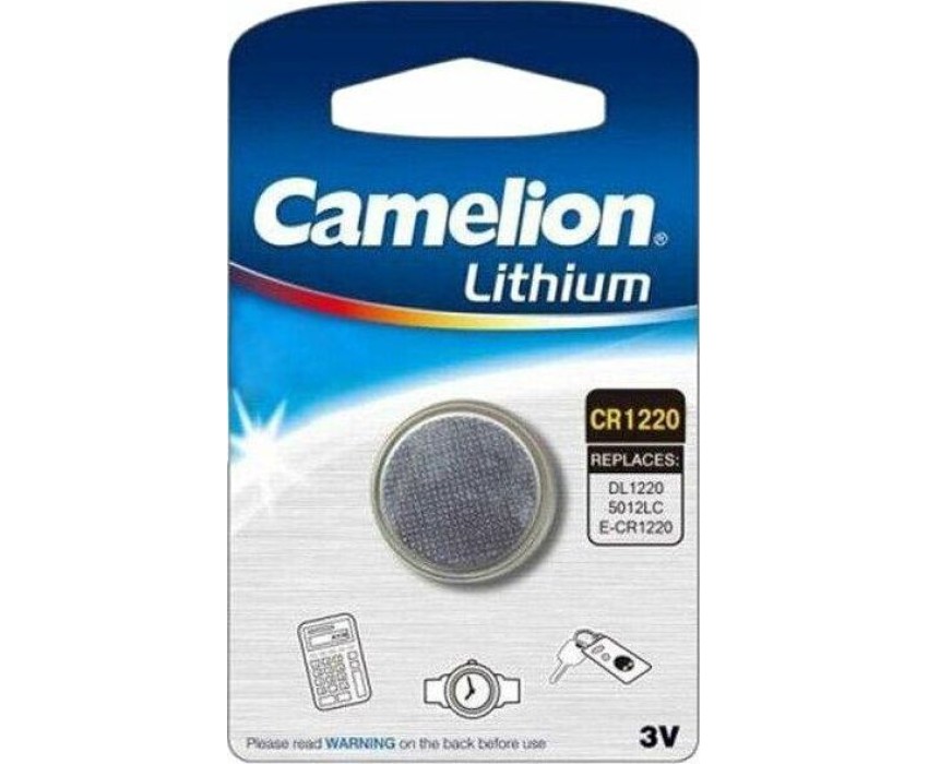Батарейка литиевая Camelion CR1220-BP1B, напряжение 3В, емкость 38мА*ч, кол-во в упаковке 1 шт., размер упаковки 55x92x3 мм, использовать при температуре от - 20 до + 60 °C, хранить при температуре от +10 до +25 °C. Срок хранения 10 лет.