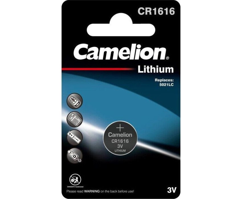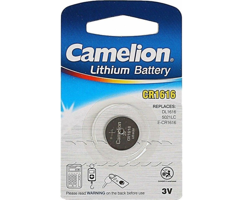 Батарейка литиевая CAMELION CR1616 BL-1 (CR1616-BP1, батарейка литиевая,3V) Батарейка Camelion CR1616-BP1B, напряжение 3В, емкость 50мА*ч, кол-во в упаковке 1 шт., размер упаковки 55x92x3 мм, использовать при температуре от - 20 до + 60 °C, хранить при температуре от +10 до +25 °C. Срок хранения 10 лет.