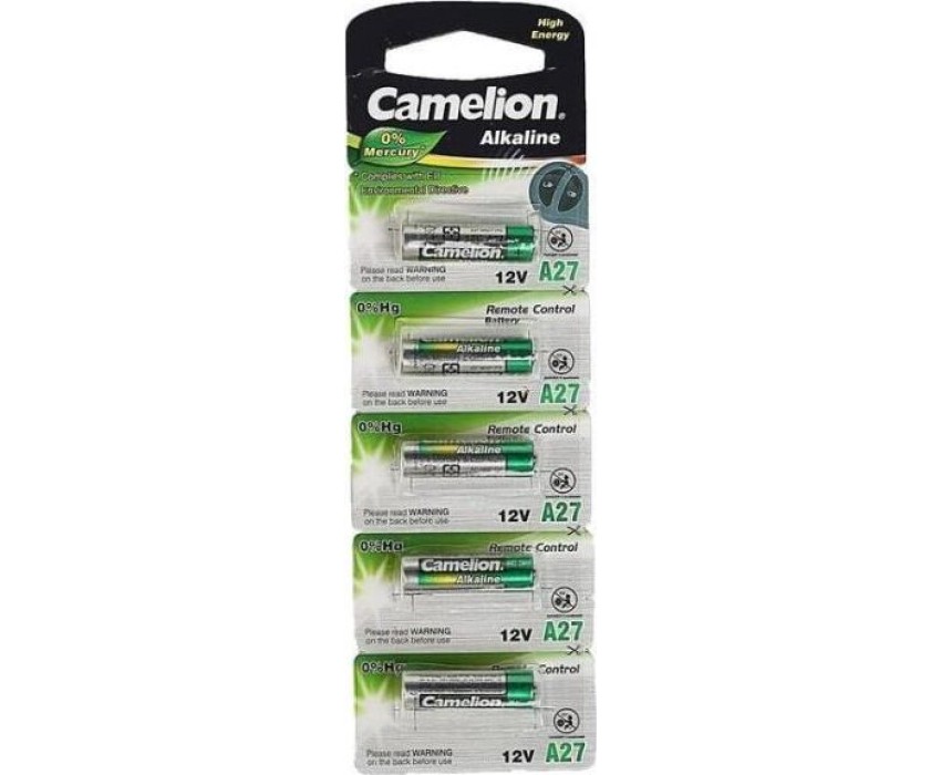 Батарейка алкалиновая Camelion LR27A BL-5 Mercury Free (A27-BP5, батарейка,12В), напряжение 12В, емкость 80мА*ч, кол-во в упаковке 5 шт., размер упаковки 50x160x10 мм, использовать при температуре от -18 до + 55 °C, хранить в сухом помещении при температуре от +15 до +25°C. Срок хранения 3 года.