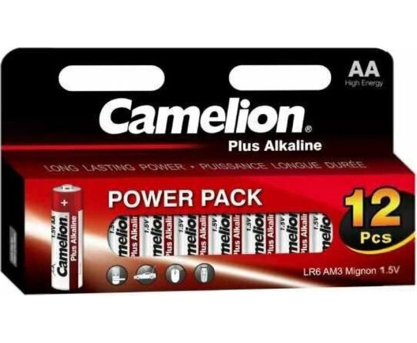 CAMELION LR 6 PLUS ALKALINE BLOCK-12 (LR6-HP12, батарейка,1.5В) Батарейка алкалиновая Camelion LR6-HP12, напряжение 1,5В, емкость 2700мА*ч, кол-во в упаковке 12 шт., размер упаковки 170x99x15 мм, использовать при температуре от -18 до + 55 °C, хранить в сухом помещении при температуре от +15 до +25°C. Срок хранения 10 лет.