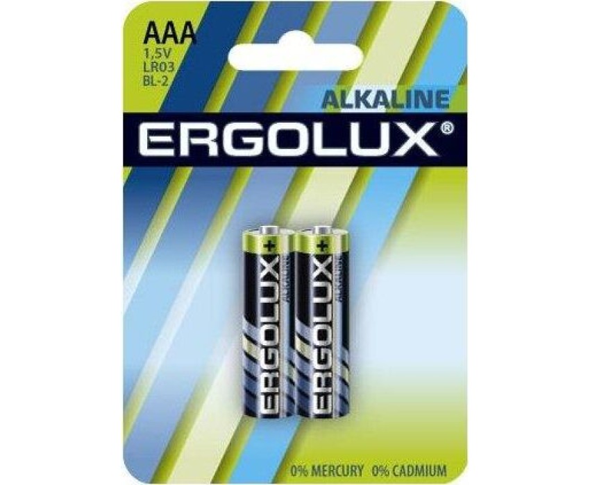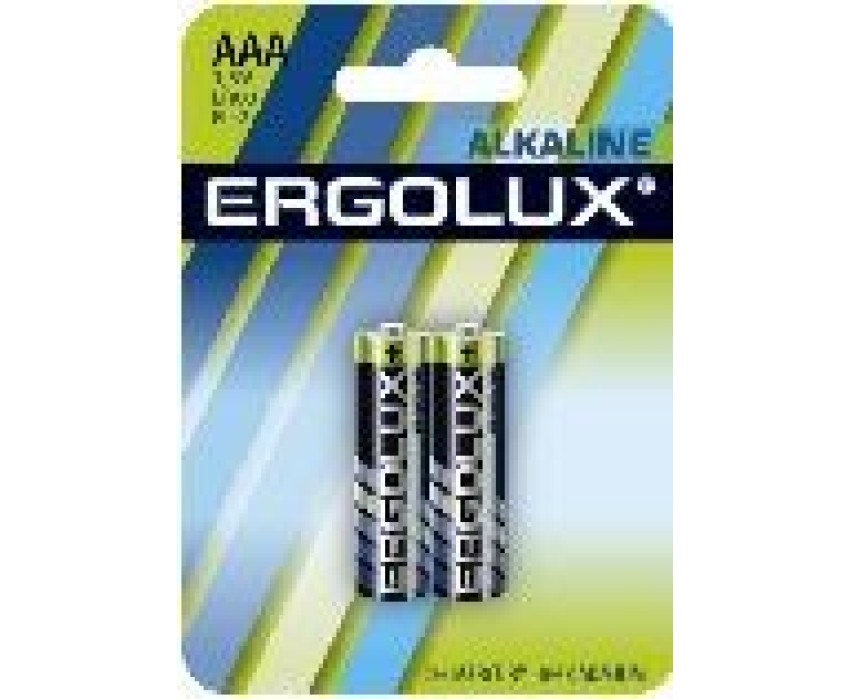 Батарейка Ergolux Alkaline BL-2 (ААА - LR03, 1.5В), напряжение 1,5В, емкость 1150 мА*ч, кол-во в упаковке 2 шт., размер упаковки 84x114x11 мм, использовать при температуре от -10 до + 40 °C