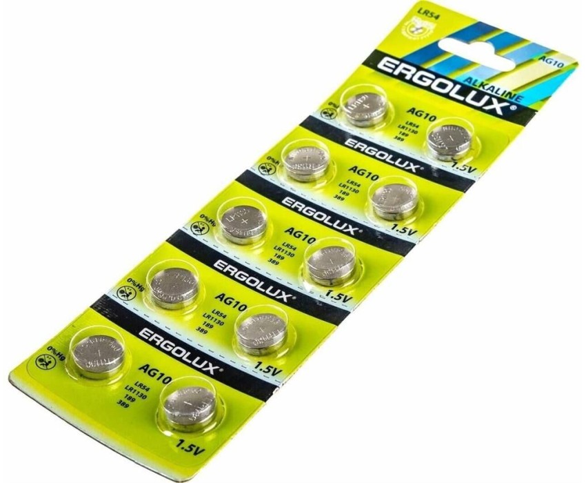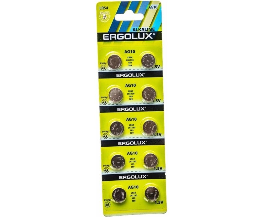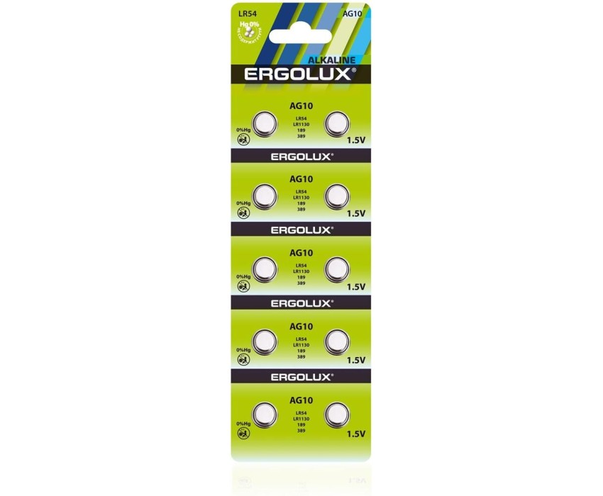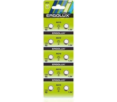 Элементы питания ERGOLUX (14321) AG10 BL-10 (AG10-BP10, LR54 /LR1130 /189 /389 батарейка для часов)