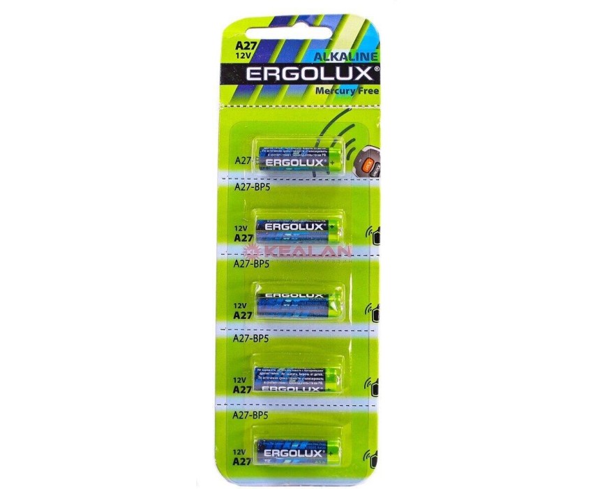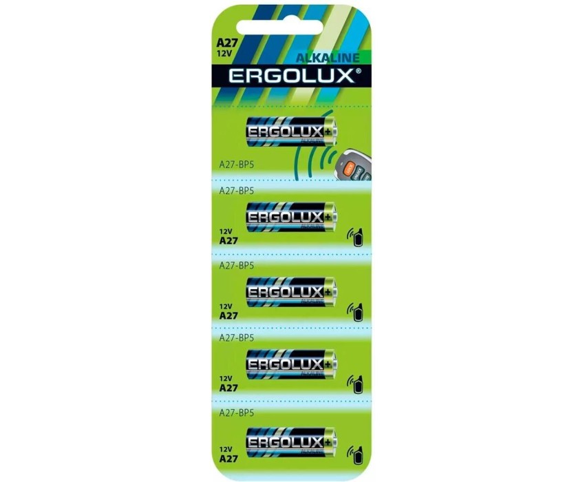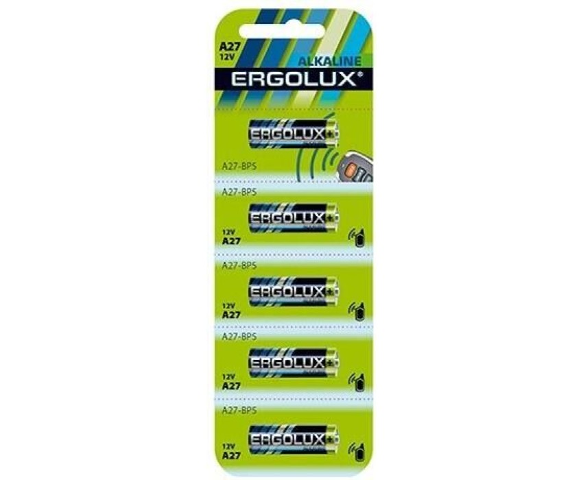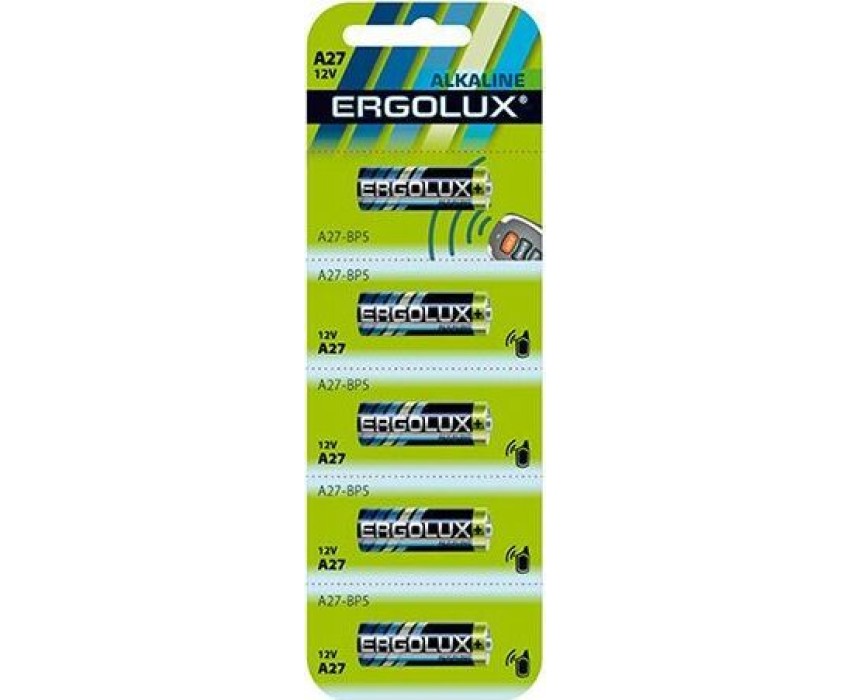 Батарейка алкалиновая Ergolux LR27A BL-5 (цилиндрическая – LR, 12В), напряжение 12В, емкость 16мА*ч, кол-во в упаковке 5 шт., размер упаковки 50x160x10 мм, использовать при температуре от + 10 до + 40 °C