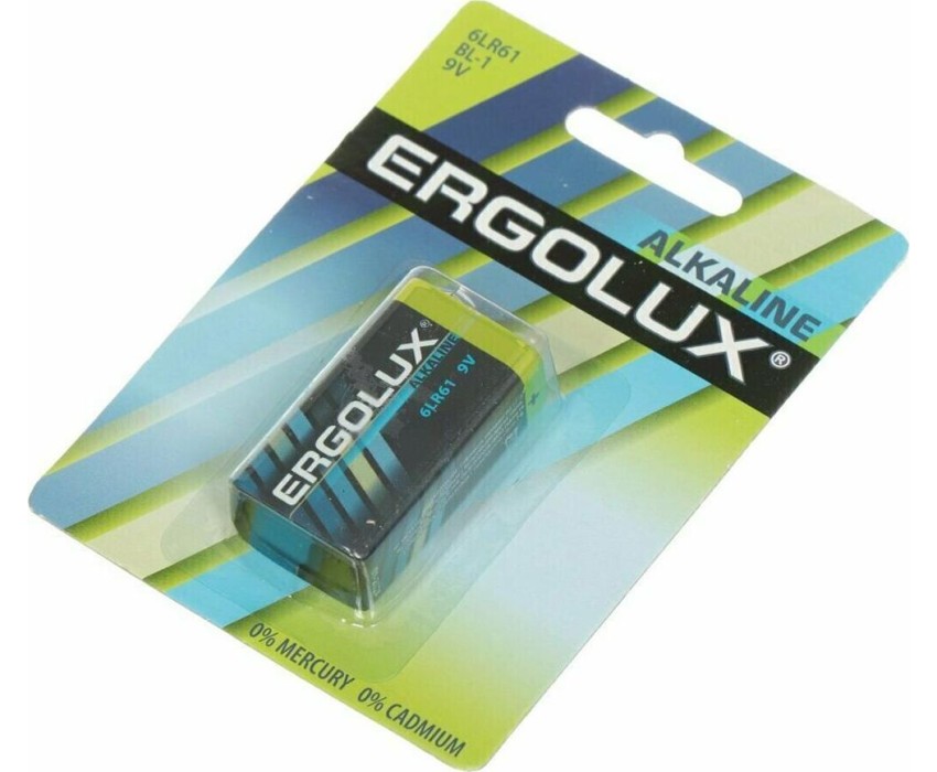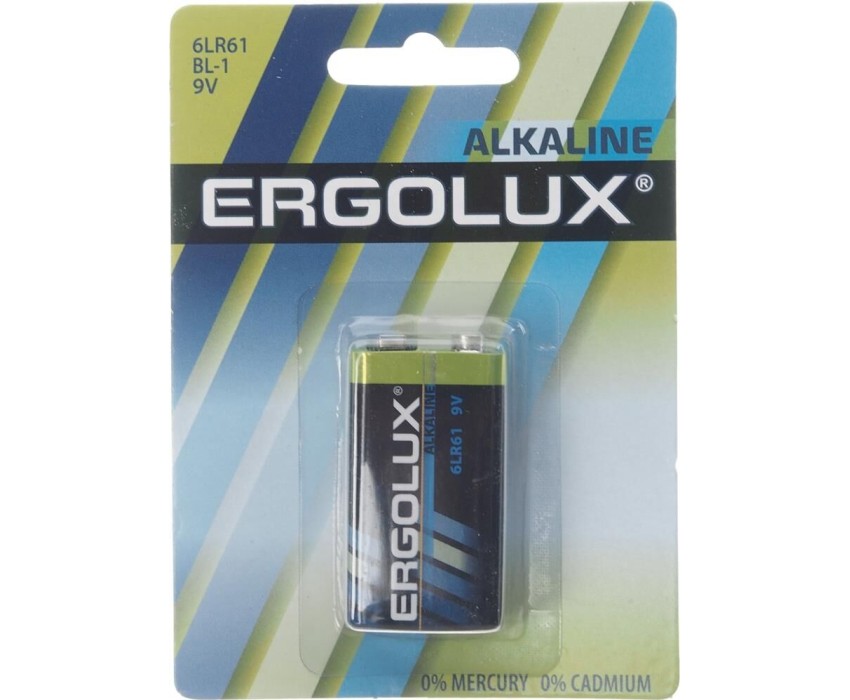 Батарейка Ergolux Alkaline BL-1 (Крона - 6LR61), напряжение 9В, емкость 700мА*ч, кол-во в упаковке 1 шт., размер упаковки 84x114x18 мм, использовать при температуре от -10 до + 40 °C