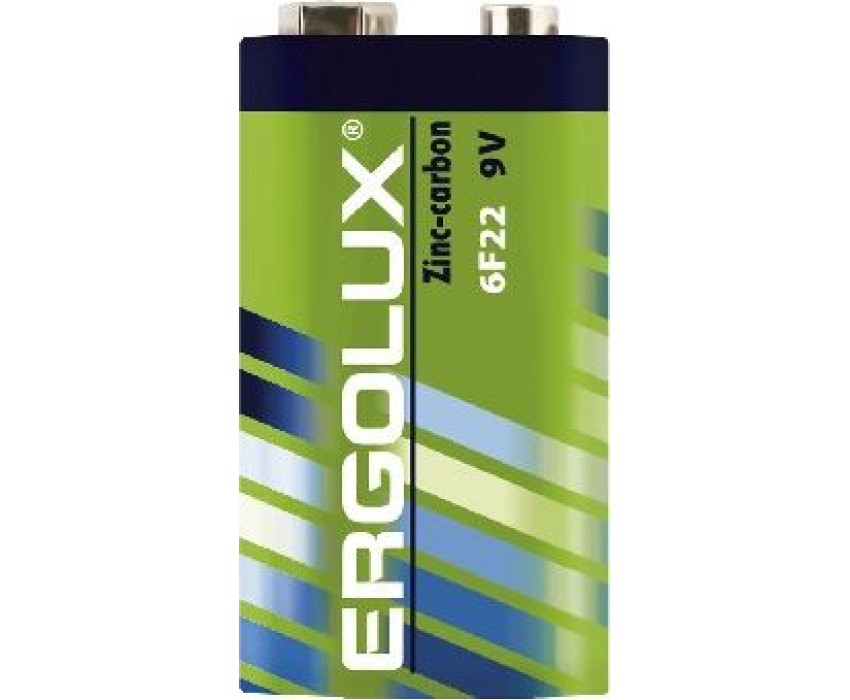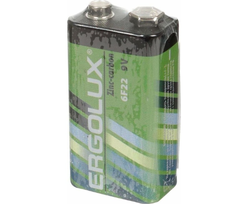 Батарейка Ergolux 6F22 SR1 (6F22SR1), напряжение 9В, емкость 450мА*ч, кол-во в упаковке 1 шт., размер упаковки 25,5x48,5x17,5 мм, использовать при температуре от -10 до + 40 °C