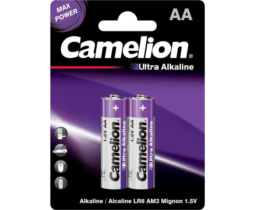 Улучшенные щелочные батарейки для устройств с высоким и импульсным энергопотреблением. Максимально широкий спектр применения. Батарейка Camelion LR6-BP2UT, напряжение 1,5В, емкость 2700мА*ч, кол-во в упаковке 2 шт., размер упаковки 84x114x11 мм, использовать при температуре от -18 до + 55 °C, хранить в сухом помещении при температуре от +15 до +25°C. Срок хранения 10 лет. Улучшенные щелочные батарейки. Проявляют повышенную работоспобность в устройствах с импульсным энергопотреблением.