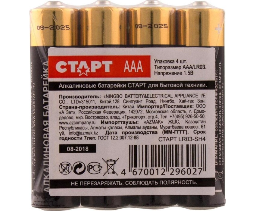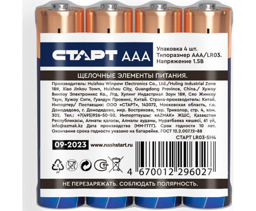 Алкалиновая батарейка СТАРТ (19137) LR03-SH4 N