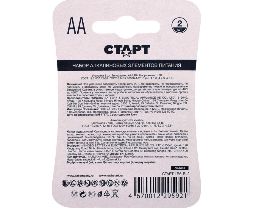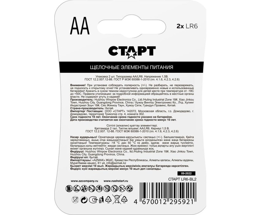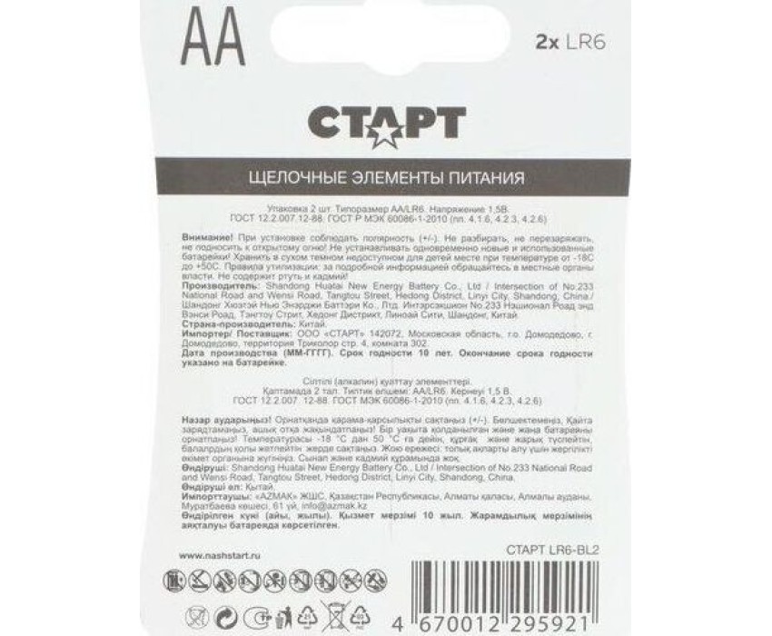 Алкалиновая батарейка СТАРТ (19144) LR6-BL2 N