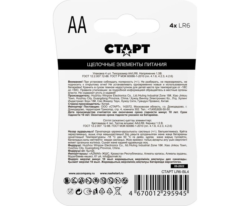 Алкалиновая батарейка СТАРТ (19123) LR6-BL4 N