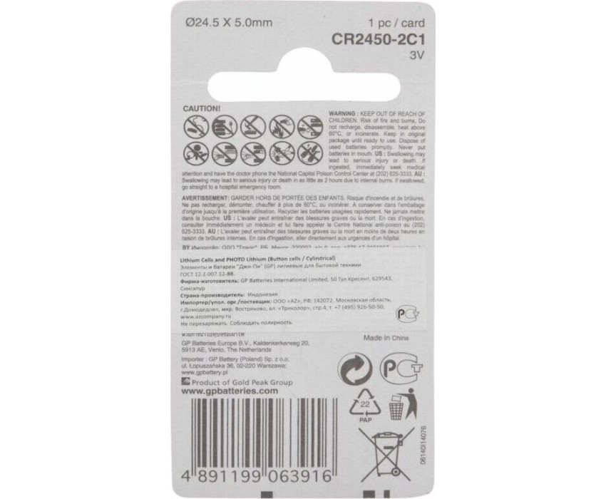 Литиевая дисковая батарейка GP Lithium CR2450 - 1 шт. в блистере
