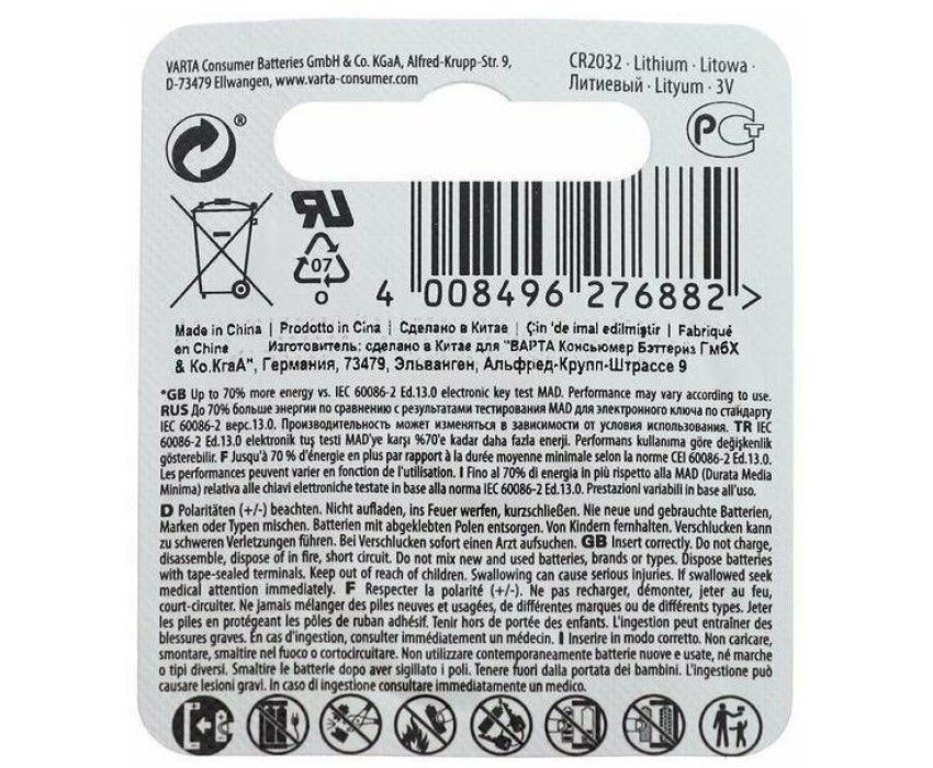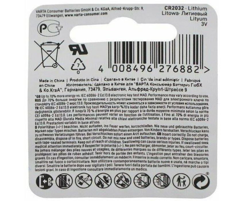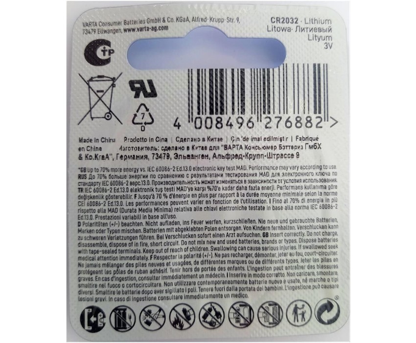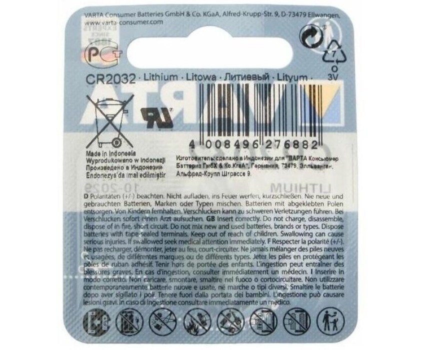 Бренд VARTA Модель BL1 Lithium Тип Батарейка Форм-фактор CR2032 Тип батареи литиевая Напряжение 3 В