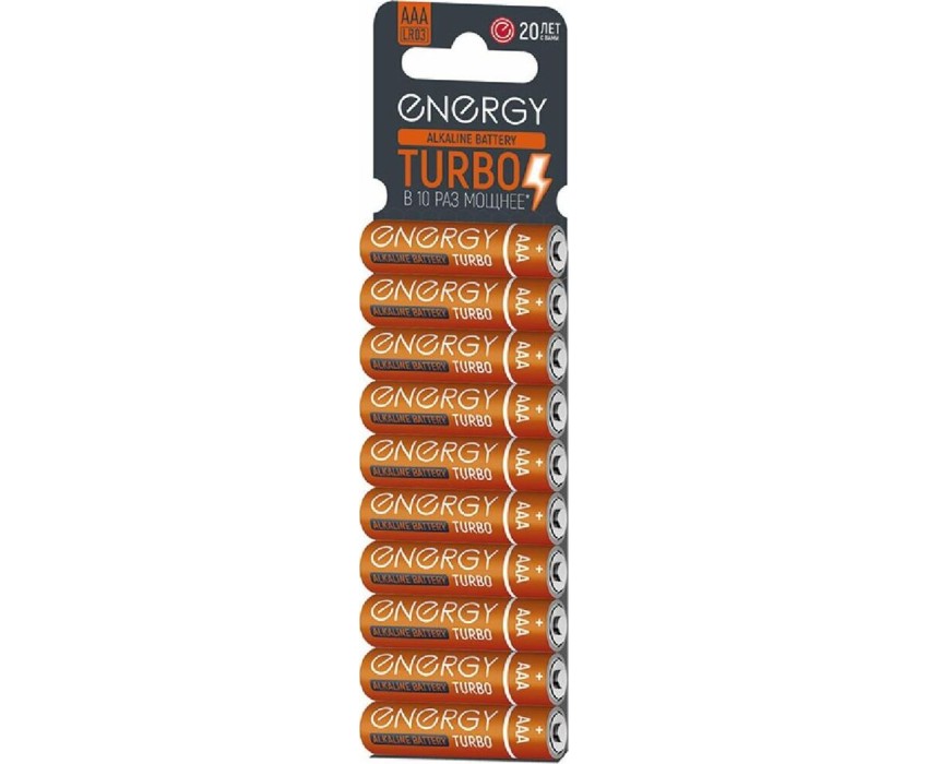 Батарейка алкалиновая Energy LR03/10KS Типоразмер - LR03 / ААА Серия Turbo Улучшенная структура цинка Высокая плотность активных матриалов Максимальная мощность Защита от протечек Стальной корпус с увеличенной толщиной стенки Срок предэксплуатационного хранения - 7 лет 10 шт в термоусадке с подвесом
