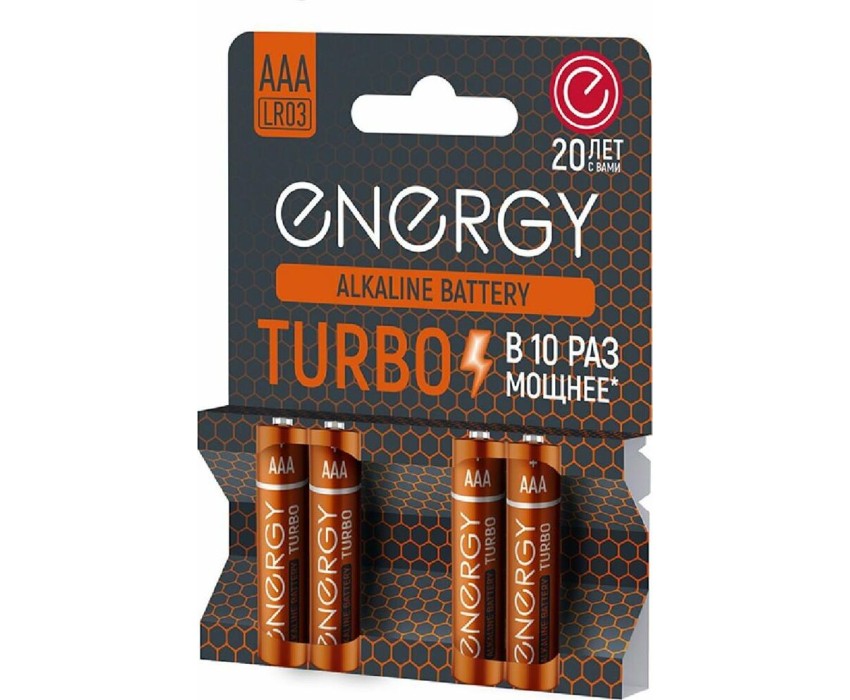 Батарейка алкалиновая Energy LR03/4B Типоразмер - LR03 / ААА Серия Turbo Улучшенная структура цинка Высокая плотность активных материалов Максимальная мощность Защита от протечек Стальной корпус с увеличенной толщиной стенки Экологичная упаковка, без использования пластика Срок предэксплуатационного хранения - 7 лет 4 шт в блистере