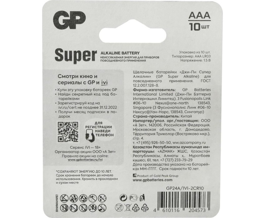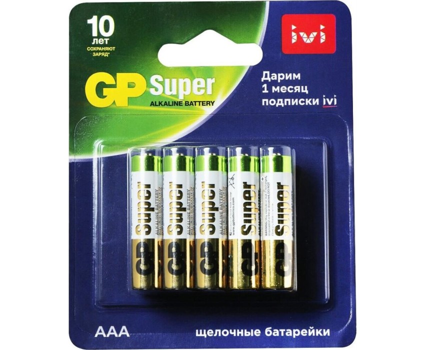 Бренд GP Модель 24A/IVI-2CR10 Тип Батарейка Форм-фактор AAA Тип батареи щелочная Напряжение 1.5 В Количество в комплекте 10 шт. Описание GP Super Alkaline AA - щелочные батарейки повышенной энергоёмкости и низкого уровня расхода заряда. Популярный "мизинчиковый" типоразмер позволяет использовать алкалиновые батарейки в широком спектре приборов: фонари, диктофоны, настенные часы, будильники, различные ПДУ и игрушки на радиоуправлении Страна производства Соединенное Королевство