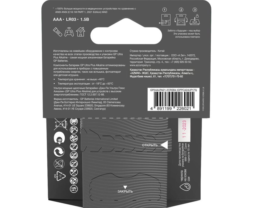 Китай Характеристики: 1,5 В; Типоразмер ААА, LR03 Номинальная емкость: 1700 мАч 4 шт. в картонном блистере