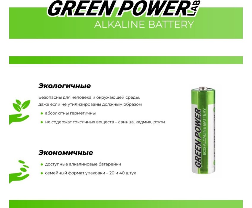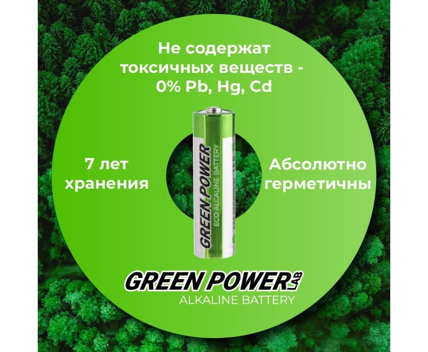 Экономичные и экологичные алкалиновые батарейки GREEN POWERlab. Безопасны для человека и окружающей среды, даже если не утилизированы должным образом. Абсолютно герметичны. Не содержат токсичных веществ - свинца, кадмия, ртути. Для обычных устройств, не требовательных к потреблению тока. Срок зранения 7 лет.