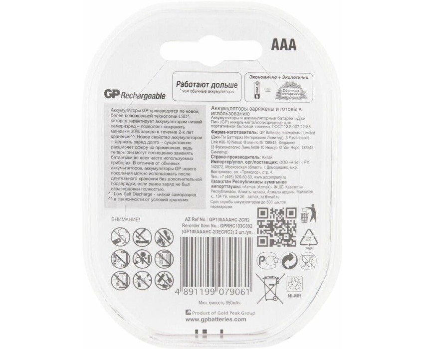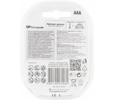 GP AAA Аккумуляторная батарейка 100AAAHC, 2 шт. 1000мAч