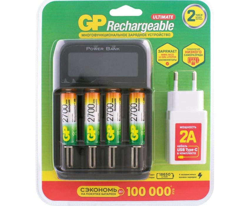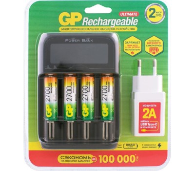 GP AA Аккумуляторная батарейка + Зарядное устройство PowerBank 270AAHCMHSPBA-2CR4, 4 шт. 2700мAч