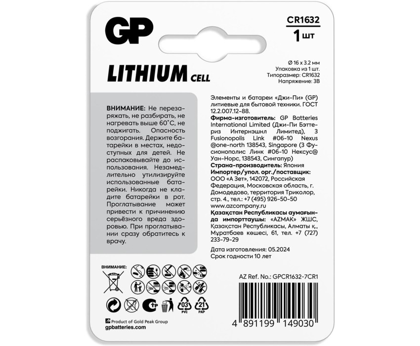 Литиевые батарейки GP CR1632(3V), 1 шт. (CR1632-7CR1) Литиевые элементы питания GP подходят для использования в цифровых устройств с высоким потреблением энергии: калькуляторы, автомобильные сигнализации, электронные термометры, кухонные и напольные весы, портативные игры, датчики, бортовые микрокомпьютеры и так далее. Батарейка GP CR1632-7CR1 характеризуется высокой удельной мощностью, несмотря на свои миниатюрные размеры. Так, номинальное напряжение батарейки составляет 3 В, а работоспособность – 840 часов (при условии 15кОм 24 ч/дн (Nост. = 2.0 В). Работает батарейка при широком диапазоне температур - от -10 до +60 °C, так что ваши устройства будут функционировать и на заснеженных улицах, и на жарком солнечном пляже. У литиевых батарей GP низкий уровень саморазряда - не более 1% в год. А срок годности достигает 10 лет.