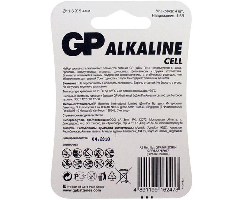 GP A76F-2CRU4 Компактные дисковые батарейки используются в качестве источников питания для наручных часов, детских игрушек с экраном, микрокалькуляторов, слуховых аппаратов. Плотность электролита и специально разработанная схема энергоотдачи обеспечивают надежную работу и длительный срок службы в электроприборах. Высокая емкость при медленной энергоотдаче делает элементы питания данного типа подходящими для многолетнего использования в высокоточных приборах. Благодаря низкотемпературным свойствам элементы питания способны стабильно работать как в домашних помещениях, так и на открытом воздухе. Технология низкого саморазряда позволяет хранить батарейки GP долгое время без использования. Магнитно-цинковое соединение в качестве щелочного электролита является экологически безопасным для эксплуатации людьми. По окончанию срока службы данные элементы питания утилизируются и могут быть переработаны без вреда окружающей среде.