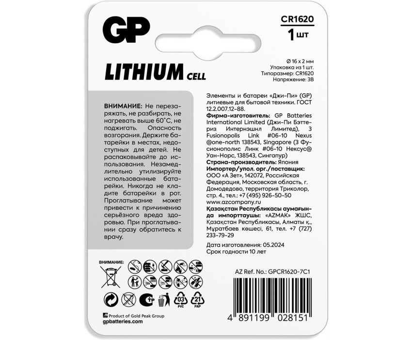 GP BATTERIES GP CR1620ERA-2CPU1 10/900
