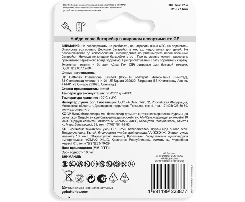 GP BATTERIES GP CR2016UP-2CCRSBC2 20/720