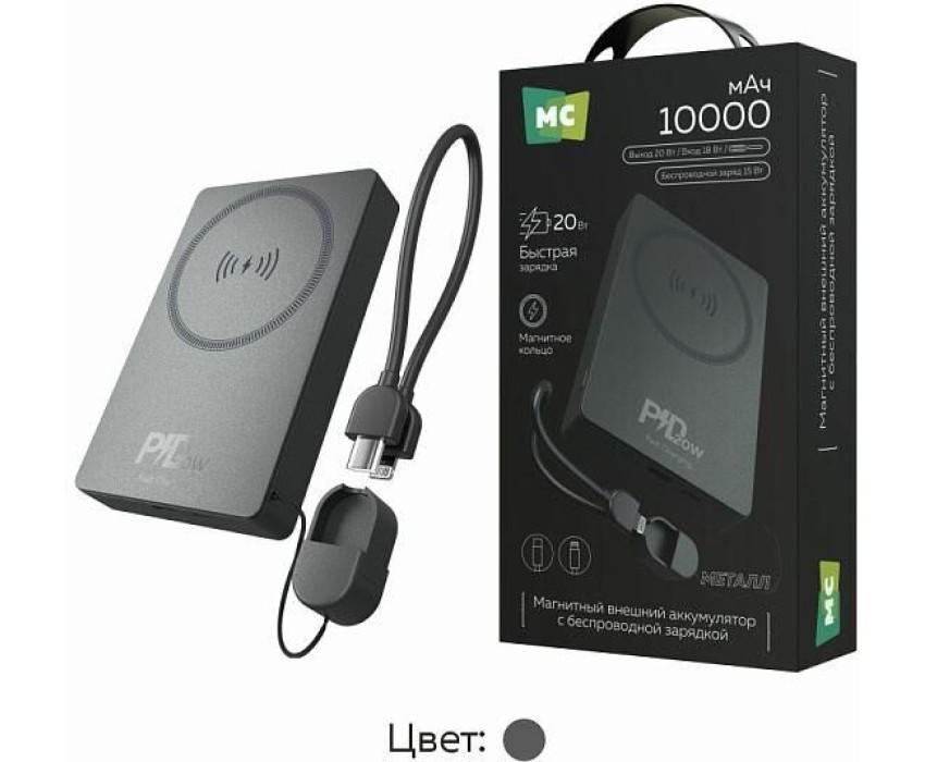 Внешний аккумулятор More Choice — идеальное решение для зарядки гаджетов в любых условиях. Он идеально подходит для поездок, активного отдыха и повседневного использования. Компактный и эргономичный, повербанк легко помещается в сумке или кармане. Оснащен технологией быстрой беспроводной зарядки, что экономит время и обеспечивает удобство в использовании. Имеет несколько выходных портов и кабель для зарядки в комплекте, что позволяет заряжать несколько устройств одновременно.