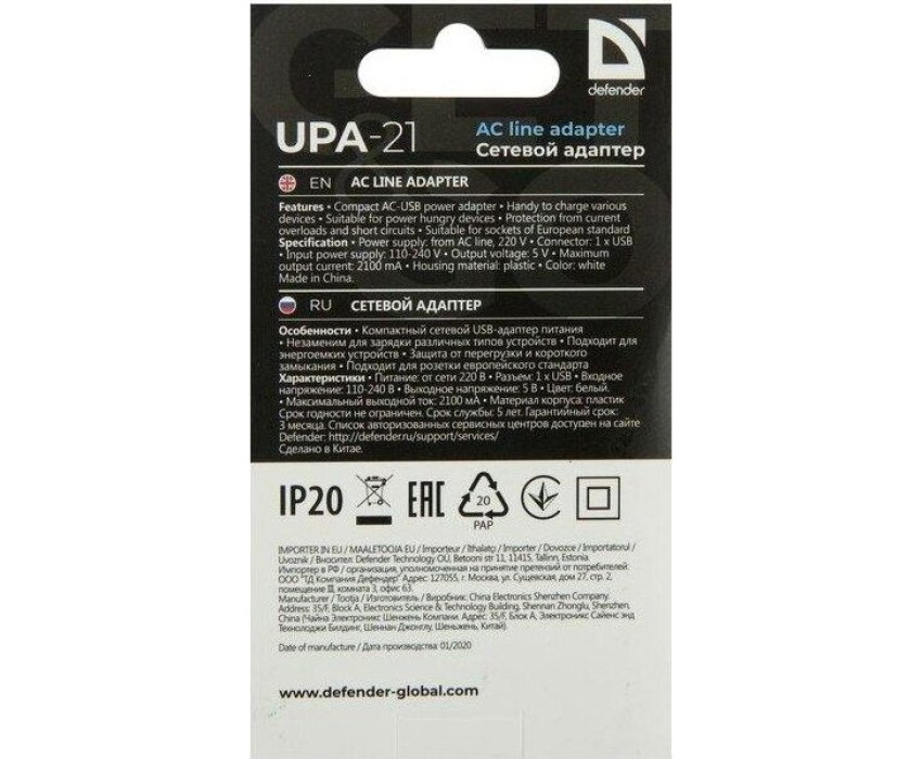 Универсальные адаптеры питания DEFENDER (83571) UPA-21 белый