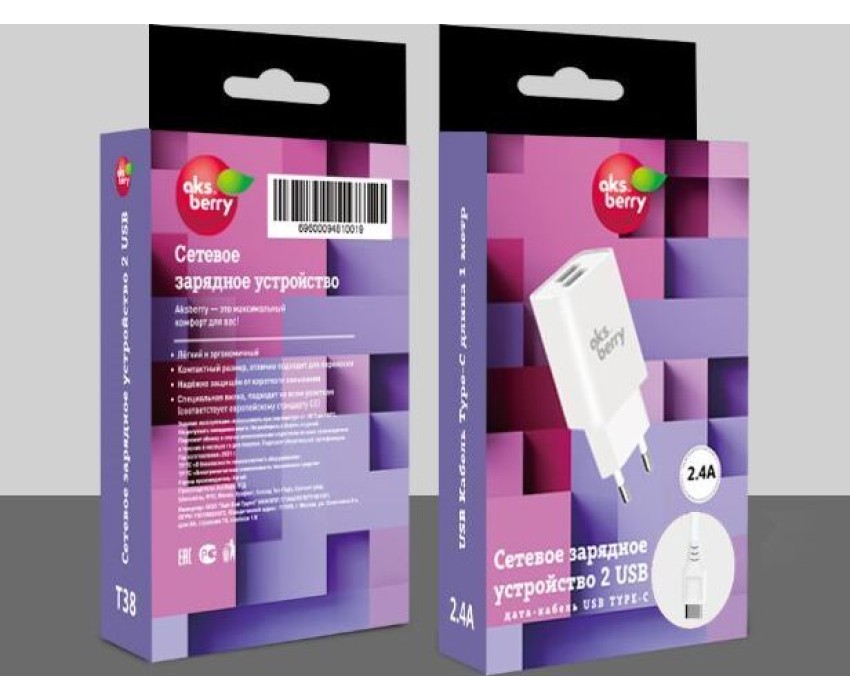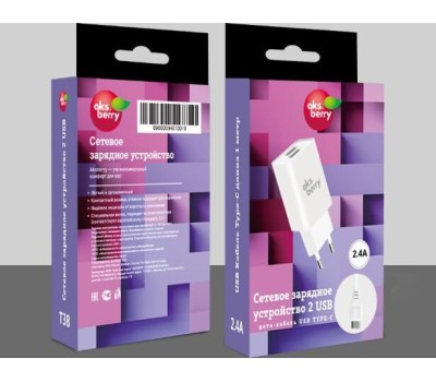 АККУМУЛЯТОРЫ И ЗАРЯДНЫЕ УСТРОЙСТВА AKSBERRY (6900203240019) T38 2 USB 2.4A + Type-C белый