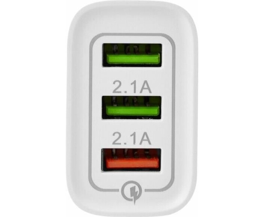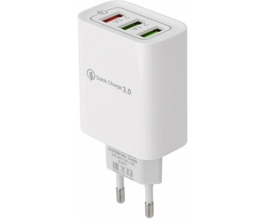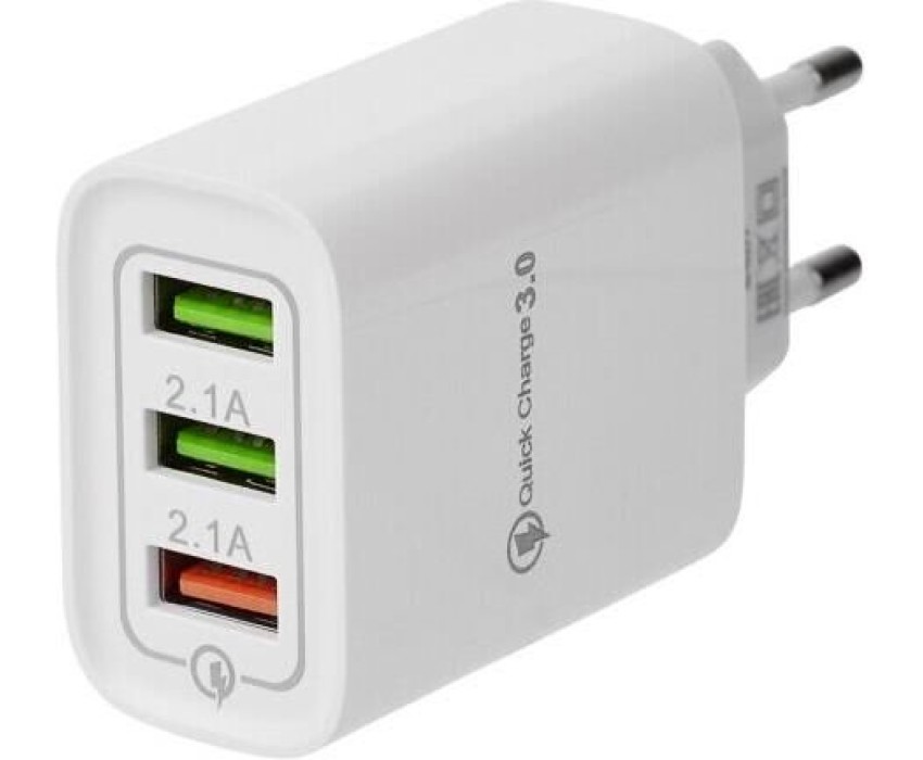 Сетевое зарядное устройство 3 x USB 5V, 2.1 А + 2.1 А + 2.1 А белого цвета предназначено для обеспечения зарядки трех портативных электронных устройств. Зарядное устройство оснащено евровилкой для фиксации в розетках российского и европейского типа. Позволит передать питание с силой тока 2.1 А и 1.8 А на различные портативные аксессуары: мобильные телефоны, планшеты, наушники, осветительные приборы, бытовую технику USB. Адаптер не подвержен перегреванию даже при подключении к нему сразу всех доступных устройств. С технологией Quick charge гаджеты заряжаются значительно быстрее, чем с обычными зарядными устройствами. Корпус сетевого адаптера изготовлен из термостойкого и ударопрочного пластика. Подбирайте адаптер исходя из необходимой мощности для зарядки устройства. Входное напряжение: 100–240 В Выходное напряжение: 5 В, 2.1 А + 2.1 А + 2.1 А, USB Ax3 Размер: 80x50x25 мм Цвет: белый