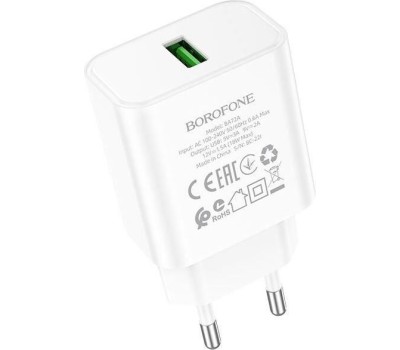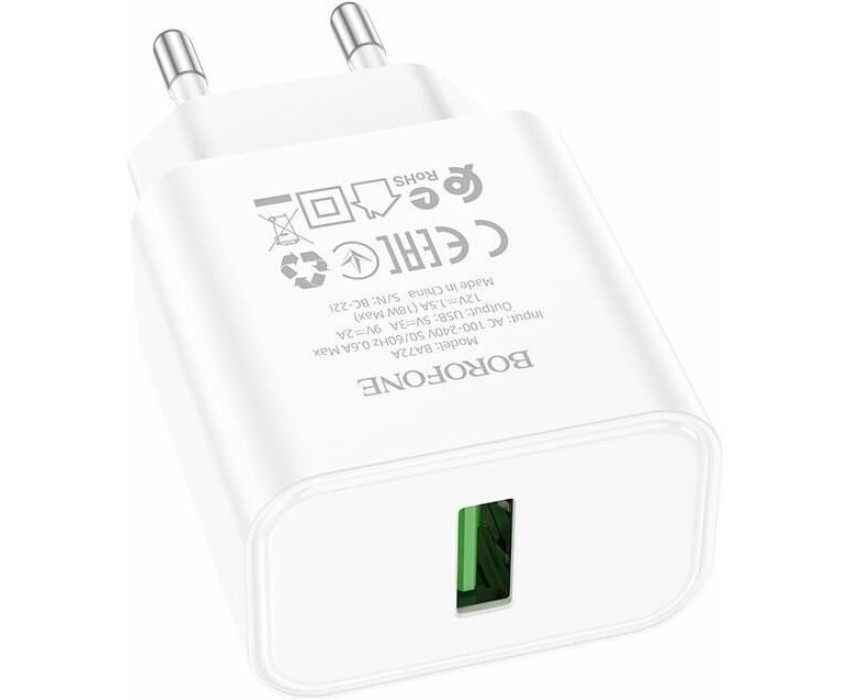 Borofone BA72A - это сетевое зарядное устройство с одним выходом USB-A и поддержкой стандарта быстрой зарядки QC 3.0, которое быстро и безопасно зарядит ваши устройства. Поддерживает силу тока до 3 А и обладает стабильным показателем мощности 18 Вт, что обеспечивает быструю зарядку устройства и сводит к минимуму возможные повреждения. Корпус изготовлен из огнестойкого пластика ABS + PC. Выполнено в двух цветах.