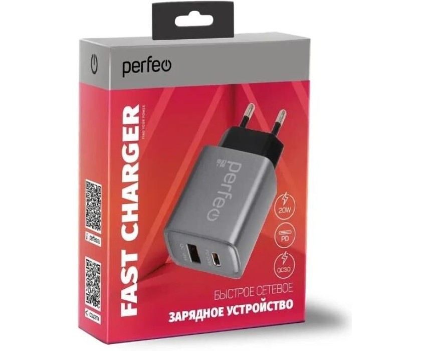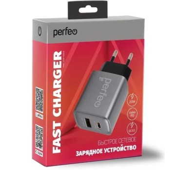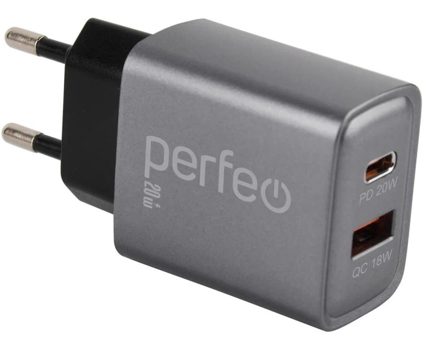 СЗУ PERFEO (I4669) 2 порта USB-A+TYPE-C, 20W, серый