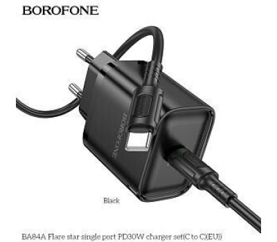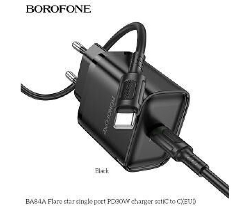 Универсальное сетевое зарядное устройство Borofone BA84A для электронной техники с портом Type-C. Изготовлен из ABS-пластика. Прочный и компактный. Поддерживает быструю зарядку. В комплекте поставляется зарядный кабель Type-C - Type-C длиной 1м