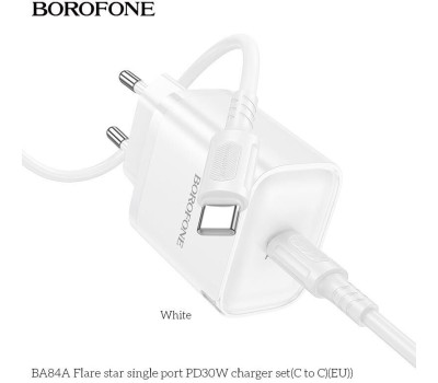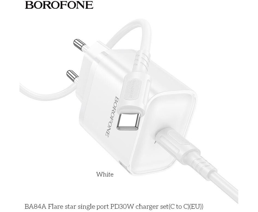 Универсальное сетевое зарядное устройство Borofone BA84A для электронной техники с портом Type-C. Изготовлен из ABS-пластика. Прочный и компактный. Поддерживает быструю зарядку. В комплекте поставляется зарядный кабель Type-C - Type-C длиной 1м