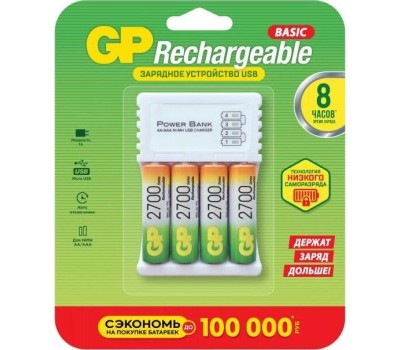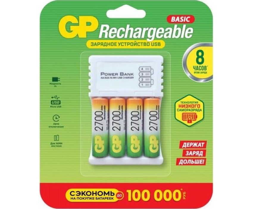 Аккумуляторы GP 2700 мАч в комплекте с зарядным устройством и кабелем (GP 270AAHC/CPB-2CR4) Элементы питания GP можно устанавливать в мощные фонари, портативную радио- и телеаппаратуру, устройства с электромоторами, включая детские игрушки на радиоуправлении. Стабильное напряжение 1,2В позволяет приборам работать равномерно, без перепадов, используя весь заряд аккумулятора в течение длительного времени. Вместе с аккумуляторами типоразмера АА в комплекте поставляется зарядное устройство и кабель для зарядки.