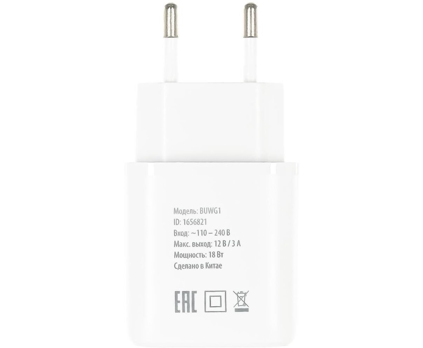 Вес товара: 45. Особенности: номинальная мощность: 18 Вт. Назначение: универсальное. Тип питания: от бытовой сети. Материал: пластик. Сила выходного тока: 3. Стандарт USB Power Delivery: QC. Габариты упаковки (ед) ДхШхВ: 0.1x0.07x0.031. Вес упаковки (ед): 0.09. Выходная мощность: 18. Количество разъемов USB-A на блоке ЗУ: 1. Гарантия: 12 мес.. Входное напряжение: 110-240 В. Выходное напряжение: 5-12 В. Размеры (ШхВхГ): 29.2 х 42 х 79 мм. Цвет: белый. Цвет: белый. Мощность: 18 Вт. Разъем на блоке з/у: USB-A x 1. Питание: от бытовой сети. Сила выходного тока: 3 A