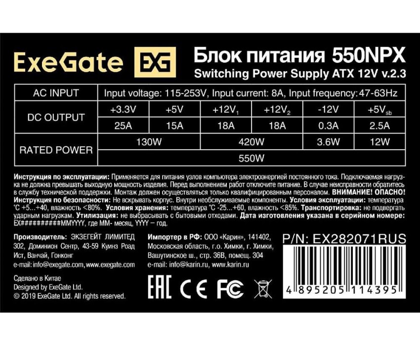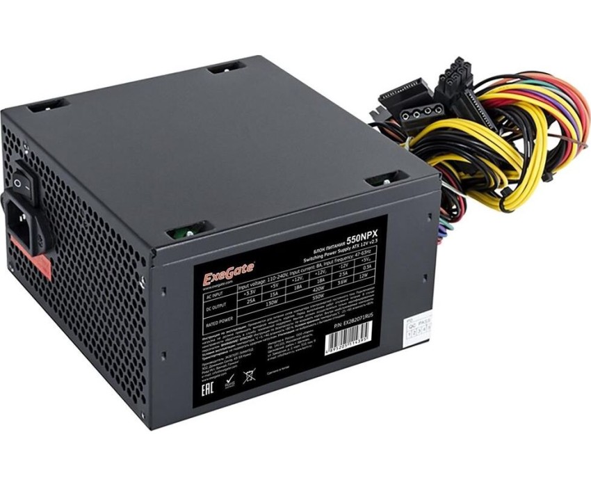 Блок питания Exegate EX282071RUS Блок питания 550W ExeGate 550NPX, ATX, black,12cm fan, 24p+4p, 6/8p PCI-E, 3*SATA, 2*IDE, FDD