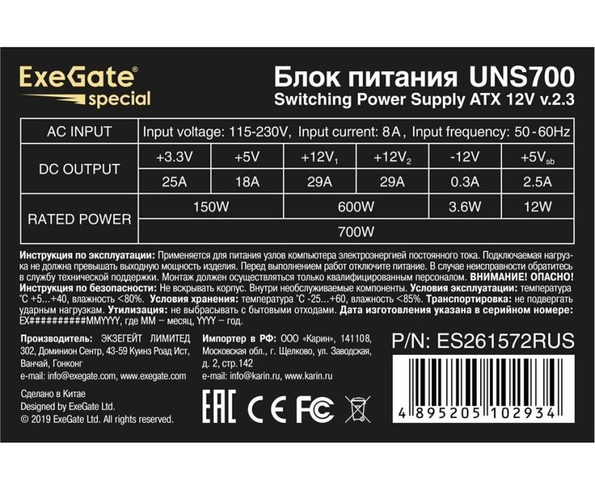 Блок питания Exegate ES261572RUS Блок питания 700W Special UNS700, ATX, 12cm fan, 24p+4p, 8/6p PCI-E, 3*SATA, 2*IDE, FDD