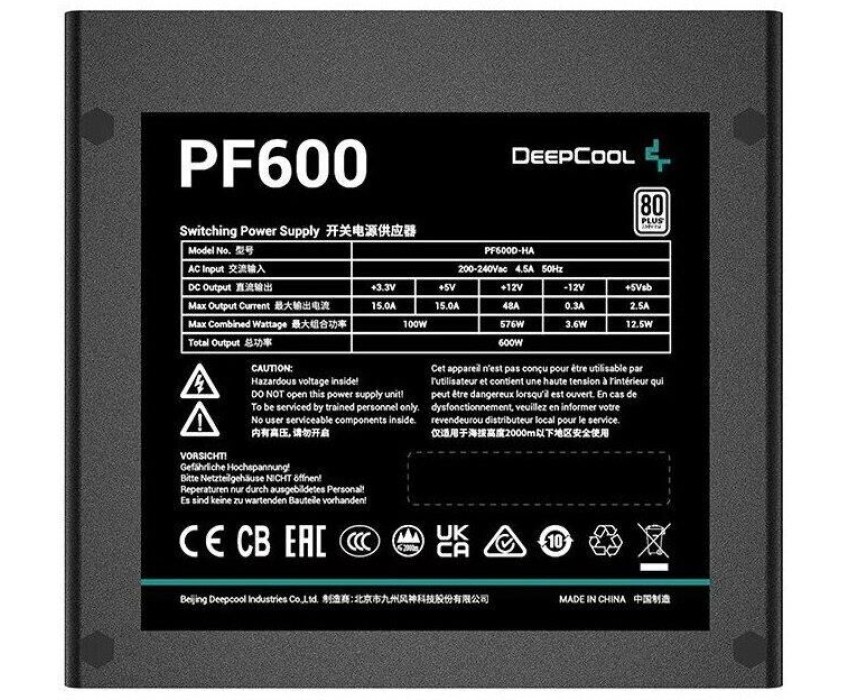 Блок питания DEEPCOOL Блок питания PF600 80+ (ATX 2.4 600W, PWM 120mm fan, 80 PLUS, Active PFC) RET